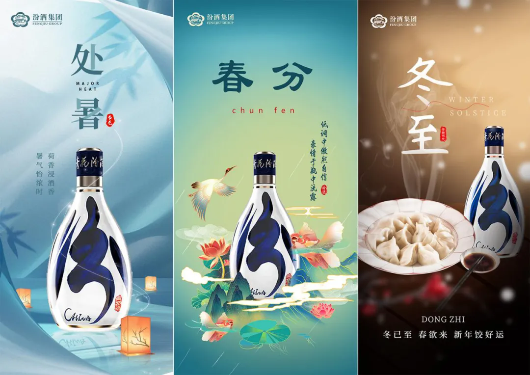 海报以手绘、摄影的形式呈现,营造浓厚的季节氛围。通过视觉艺术展现汾酒与自然和谐共生的美好愿景。将汾酒的清香型特质、悠久的历史传承与节气的时令变化相结合,传递出汾酒不仅是时间的佳酿,更是自然之美的见证者。